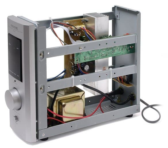 Также на передней панели расположен регулятор общей громкости, а также кнопки выключения питания и выбора режимов коммутации. На задней стороне блока находятся механические зажимы для подключения колонок и два линейных входа (разъем стерео-RCA).