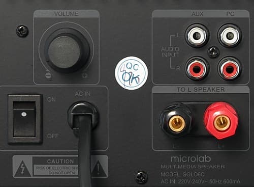 На задней панели колонок расположены два равноправных входа, AUX и PC — стерео RCA разъемы. Текущий вход выбирается с пульта ДУ. Регулятор громкости на задней панели дублирует пульт. Это цифровой безупорный регулятор. Механический выключатель питания на задней панели сбрасывает установку громкости и тембров.