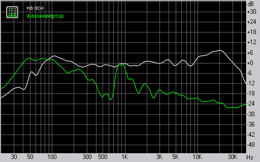 Характер АЧХ полностью соответствует измеренной характеристики предыдущей модели. Все тот же подъем на граница диапазона, который благотворно сказывается на паспортных параметрах, увеличивая диапазон частот. Низких частот, судя по графику, даже многовато. В реальной ситуации эффективность работы фазоинвертора зависит от расположения колонок относительно стола и стены. Наши измерения соответствуют поведению АС в четверть-пространстве (стол и стена, вдали от углов).