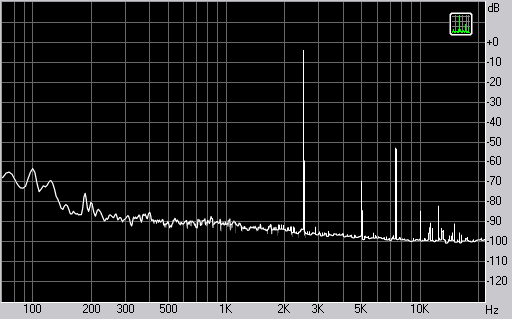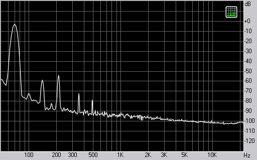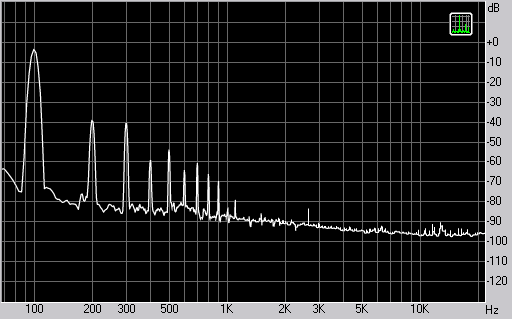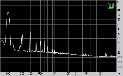 Измерения показали весьма неординарные хорошие показатели в области низких частот, где искажения падают до 0,1%, а уровень третьей гармоники весьма мал. Это заслуга качественного НЧ-динамика. Спектр сигнала, воспроизводимого фронтальной колонкой при подаче частоты 100 Гц