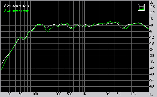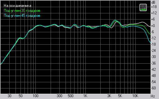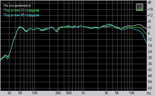 Внеосевые АЧХ характеризуют направленность на ВЧ. Как показывают измерения, в данном случае внеосевая АЧХ имеет спад на ВЧ начиная с 6 кГц. Однако естественный небольшой подъем на ВЧ приводит к тому, что под углом 30 градусов получается ровная АЧХ. Отметим здесь же, что ярко выраженной направленности на слух не замечено. Это хороший результат.