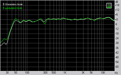 Измерения перед НЧ динамиком. Рабочий диапазон колонки уверенно захватывает частоты, начиная с 40 Гц. Среднечастотная область на графике — результат работы СЧ-динамика, зафиксированный всенаправленным измерительным микрофоном.
