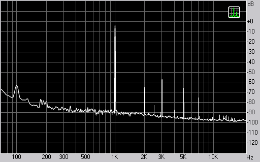 На средних частотах добавляются гармоники высших порядков. На спектре с тестовым тоном 1 кГц хорошо видны третья, пятая и седьмая гармоники. Это наиболее проблемная область, где суммарные искажения доходят до 1%.