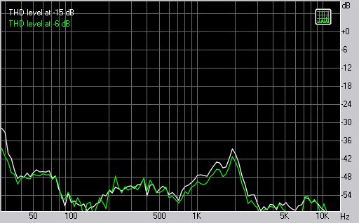 Начиная с 2,5 кГц в работу вступает ВЧ-динамик и мы вновь видим низкое количество искажения, стремящееся к 0,1%.