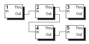 В этой схеме устройство 1 служит источником сообщений, которые получает устройство 2 и через его ретранслятор — устройство 3. Устройство 4 получает сообщения, посылаемые устройством 2 (они могут как включать, так и не включать получаемые самим устройством 2) и ретранслирует их на вход устройства 5.