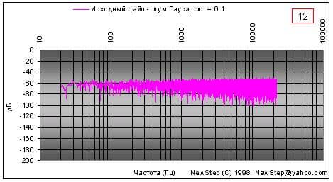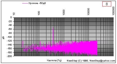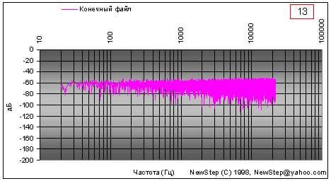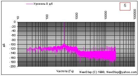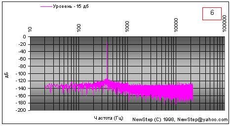 Отметим одну особенность: шум квантования порождается самим сигналом. Это означает, что возможны боковые частоты, на которых шум отсутствует. При анализе учитывались только те спектральные отсчеты, в которых была зафиксирована энергия (> -250db).