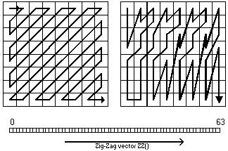 DCT использует тот факт, что пиксели в блоке и сами блоки связаны между собой (т.е. коррелированны), поэтому происходит разбивка на частотные фурье компоненты (в итоге получается quantization matrix — матрица преобразований данных из непрерывной в дискретную форму, числа в которой являются величиной амплитуды соответствующей частоты), затем алгоритм Quantization разбивает частотные коэффициенты на определенное количество значений. Encoder (кодировщик) выбирает quantization matrix которая определяет то, как каждый частотный коэффициент в блоке будет разбит (человек более чувствителен к дискретности разбивки для малых частот чем для больших). Так как в процессе quantization многие коэффициенты получаются нулевыми то применяется алгоритм зигзага для получения длинных последовательностей нулей (Рис.3)