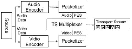 - MPEG-2 Transport Stream (Рис. 6) — внешнее вещание в среде с высоким уровнем ошибок — передает транспортные пакеты (длиной 188 либо 188+16 бит) двух типов (сжатые данные — PES — и сигнальную таблицу Program Specific Information — PSI).