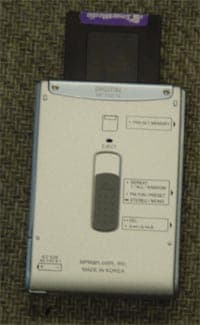 Прорезь для "музыкарточки" находится на верхней части плеера. Внутри этой прорези все-таки есть маленькая подпружиненная пылезащитная крышечка, похожая на ту, что устанавливается в 3-дюймовых дисководах. Для извлечения карты нужно воспользоваться ползунком на тыльной стороне плеера, что не всегда удобно. Казалось бы, надо вынуть карточку — переверни плеер и сдвинь ползунок. Но не обо всем подумали разработчики. Дело в том, что у плеера нет клипсы для крепления на поясе, задняя поверхность гладкая. Я наклеил на нее две полоски-"липучки" для того, чтобы крепить плеер на приборную панель в машине. Получилось замечательно. Только теперь каждый раз для замены карточки плеер приходится отдирать с насиженного места. Но одной рукой карточку все равно не сменить. Нет, SMC — все-таки не компакт-кассета: слишком тонкая, хрупкая, и контакты торчат наружу. С точки зрения удобства использования это совершенно неграмотный конструктив. В этом плане Memory Stick от Sony гораздо привлекательнее: корпус более толстый и прочный, а контакты защищены специальными ребрами.