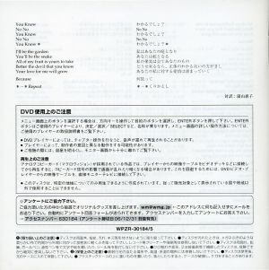 Что касается вкладышей, то один из них — обертка корешка диска. А другой представляет собой буклет с вступительной статьей (на японском), текстами песен (на английском и японском) и краткой информацией об издании (на японском).