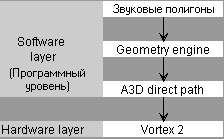 Чип Vortex2 сам по себе не дает ничего, реализовать его возможности позволяет специализированный интерфейс A3D 2.0, включающий технологию Wavetracing. При этом архитектура Vortex2 специально разработана так, чтобы наилучшим и самым оптимальным образом выполнять на аппаратном уровне функции и алгоритмы, используемые в A3D.