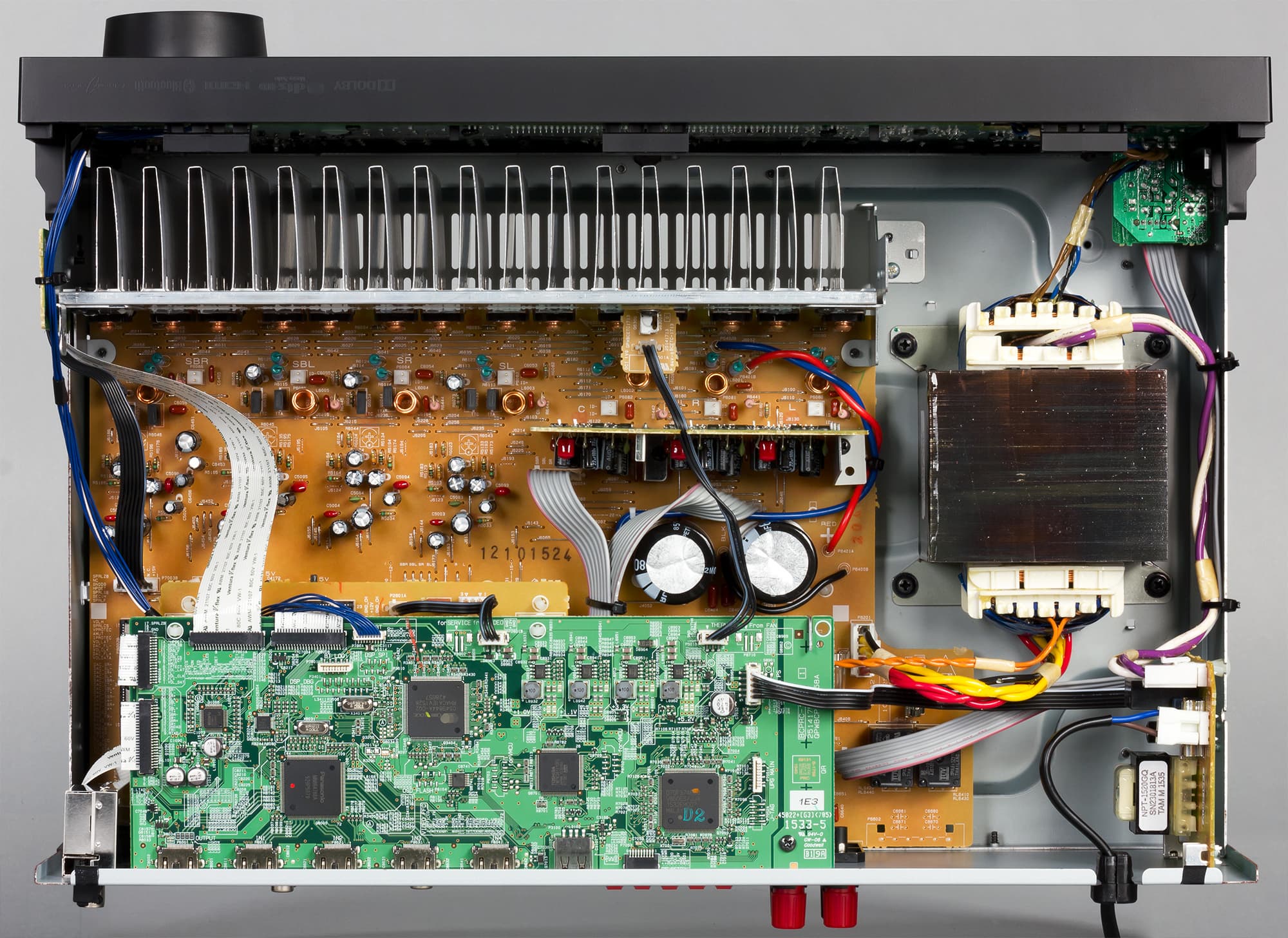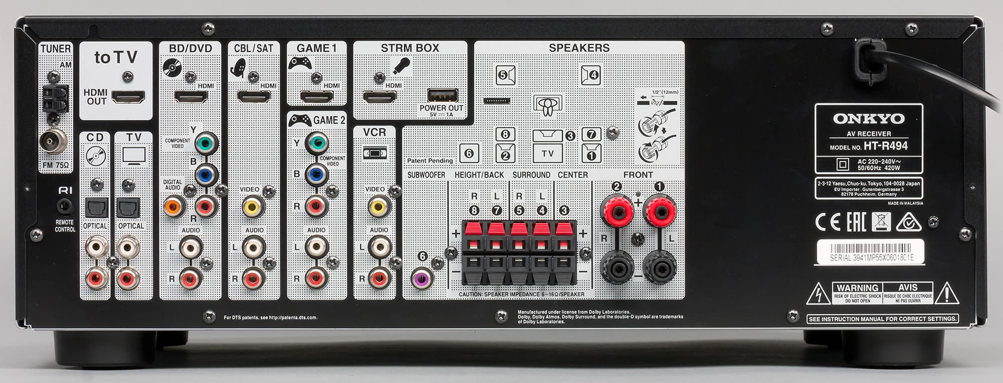 Клеммы фронтальных колонок винтовые, остальные пружинные. Сабвуфер подключается к ресиверу стандартным RCA-кабелем длиной 3 метра. Очень понравились интуитивно понятные подписи к разъемам HDMI. Выход HDMI один, для просмотра на проекторе приходится переключать кабель, но это типично для аппаратов начального и даже среднего уровня. У ресивера на удивление большое количество аналоговых входов — возможно, владельцам устаревшей техники это может оказаться полезно. LAN-разъема нет, т. к. ресивер не поддерживает работу в локальной сети. USB-порт есть, но его предназначение — питание опционального мультимедийного плеера Strm Box.