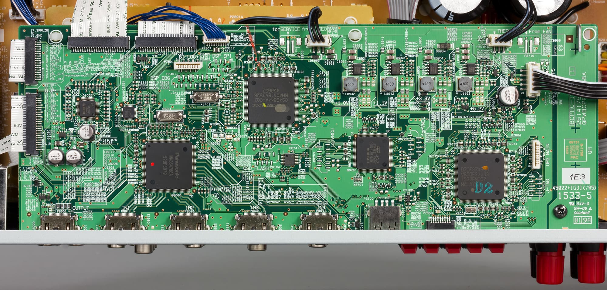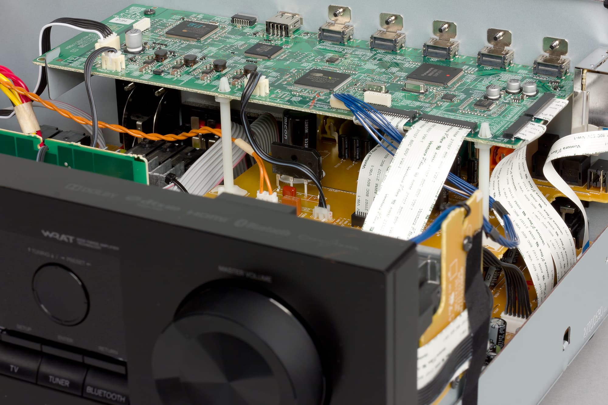 На передней панели ресивера расположен информационный дисплей, под ним — клавиши управления режимами работы. Крупный поворотный регулятор громкости расположен справа. Порадовало наличие выхода на наушники, огорчило отсутствие переднего HDMI-входа.