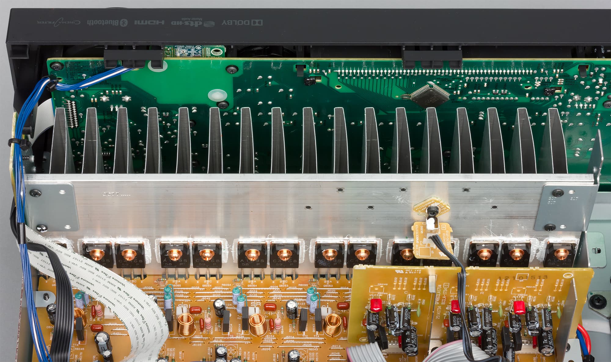 «Dolby Atmos enabled system» означает, что кинотеатр поддерживает новый формат объектно-ориентированного звука Dolby Atmos, и поддержка эта реализована не только на программном уровне в ресивере. Здесь безо всяких дополнительных вложений можно организовать полноценную схему 5.1.2. Каждая фронтальная колонка подключается к двум парам клемм на ресивере. От одной пары клемм сигнал идет для традиционных фронтальных каналов, а от другой — к динамику, расположенному в верхней плоскости колонки. Звук этого динамика отражается от потолка, реализуя высотный канал, необходимый для Dolby Atmos. Наличие отдельных клемм позволяет, при желании, подключить сигнал для высотного канала к потолочным колонкам, коих сейчас выпускается множество.