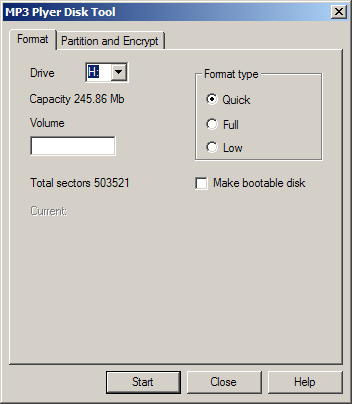 А эта возможность (правда, скорее, не аппаратная, а программная) вызывает некоторый интерес, особенно, если вы планируете использовать плеер не только как плеер, а еще как флэшдрайв (не самое оправданное применение, учитывая весьма скромную скорость, но все-таки). Смысл заключается в том, что при помощи специального софта (см. скриншоты) мы можем разбить флэш-диск на 2 раздела, один из которых по-прежнему сможет использоваться для хранения музыки, а второй будет спрятан и зашифрован паролем.