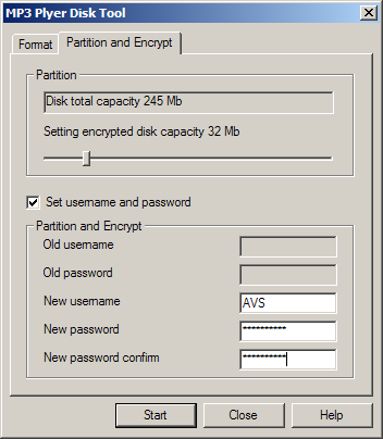 Происходит это так. Запускаем программу, задаем количество места, отводимого под зашифрованный диск, вводим имя и пароль для доступа и жмем кнопочку для переразметки (при этом все данные в памяти плеера теряются).