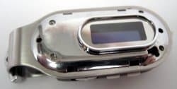 Как я уже заметил, MP320 на первый взгляд довольно необычен, напоминая не столько MP3-плеер, сколько крупных размеров брелок или уменьшенный почти в 2 раза «мобильник-раскладушку». Форма корпуса продолговатая со скругленными концами, на обратной стороне которого размещена клипса, которая пригодится для ношения плеера на поясе, но будет определенной помехой при других способах размещения на одежде. Размеры плеера достаточно компактные. В спецификации указано 65 × 25 × 10 мм, но, воспользовавшись простым штангенциркулем, я получил немного другие данные — 67 × 30 × 18 мм. Ненамного больше обещанного (если не считать толщину), но больше, что нехорошо. Да и размеры для плеера такого класса все-таки великоваты. Что касается стиля, то это типичный вариант «для девочек», причем, не в самой лучшей его реализации — не каждая девочка захочет носить плеер на поясе. Женский пол, как показала практика, предпочитает симпатичные кулоны. Ситуацию, конечно, несколько исправляет находка, обычно свойственная мобильным телефонам, - разноцветные пластмассовые сменные панельки для корпуса, коих насчитывается целых 7 штук (причем, все их можно найти в комплекте устройства, а не покупать за отдельную плату). Идея интересная, но будет ли она способствовать покупательскому спросу — покажет практика. Впрочем, решение это далеко неоригинально и очень подозрительно смахивает на Samsung YP-F1Z, да и JUMPER T6 имеет очень похожие формы.