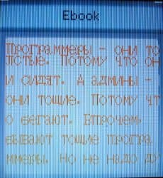 Как и две предыдущие возможности, просмотр текстов является чисто «галочной» функцией. На этот раз особенно не повезло MP720C, который несмотря даже на свой солидный по размерам экран имеет настолько жуткие шрифты и цветовую гамму, что читать на нем, я думаю, не смогут даже пользователи с особо крепкими нервами и зрением. MP730C на его фоне смотрится чуть лучше, но маленький экран и тоже далеко не идеальные шрифты не позволят и его использовать в качестве даже самой примитивной «читалки». С другой стороны имеется поддержка русского языка (CP1251) и возможность сохранения позиции в тексте, но при этом отсутствует какая-либо нумерация страниц. К сожалению, весьма жалкое зрелище.