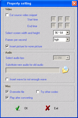 Как и в случае с MTV, нам позволят вырезать из клипа нужную часть, выбрать необходимое разрешение (128×96 или 96×64), а также fps, которое правда теперь задается не числом, а обтекаемыми понятиями «low» и «high». Можно еще заменить оригинальную звуковую дорожку любой другой, а вот цветовую схему менять в отличие от MTV тут не позволяется.