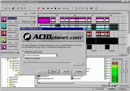 - многоканальный редактор ACID XPress 2.0 от Sonic Foundry для создания современной танцевальной музыки на профессиональном уровне из семплов и закольцованных фрагментов (включает коллекцию из 17 Мб демонстрационных семплов и 3 готовых демо-композиции):