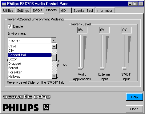 Карты Philips имеют поддержку всех нужных API — EAX1.0/2.0 и I3DL2. Качество реверберации движка QSound Environmental Modeling — вполне приемлемое, но на любителя. Мне лично больше понравился звук без включения EAX, так как без реверберации он становится более чётким и ясным. С другой стороны, то, что не понравилось мне, может понравиться вам, и наоборот. Я бы лично отдал все 3D-звуки вместе взятые просто за хорошее качество семплов, возможность избежать SRC и качественное микширование каналов. В многоколоночной конфигурации для позиционирования лучшим способом остаётся стандартное для DS3D панорамирование. На двух колонках и в наушниках лучше всех звучит Sensaura. Движок QSound3Dinteractive в этих условиях также неплох, особенно аппаратная его реализация на картах Philips. Не вздумайте судить о качестве алгоритмов QSound по картам на чипе FM801AU, для которых до сих пор даже нет поддержки EAX в драйверах.