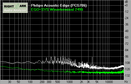 Режим работы один и тот же, 16 бит 48 кГц, а картинки разные. У различных мультимедийных звуковых плат проблема не столько в абсолютном значении уровня шума, сколько в его окрашенности. То есть вместо равномерного и не мешающего шипения стоит среднечастотный треск, скрадывающий детали звучания. Насчёт наводок от видеокарты и остальных устройств — это всё, друзья мои, ерунда. В соседнем слоте стоит профессиональная карта без всяких там экранов, а просто с качественными (дорогими) преобразователями, и "не жужжит".