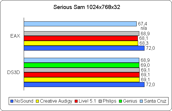 В плане быстродействия разница между различными звуковыми картами на современном PC в играбельных разрешениях не стоит даже упоминания. Основным тормозом является звуковой движок игры. Разница между включенным и выключенным звуком для различных разрешений колеблется от 4% в 1024×768×32 до 6% в 640×480×16. При этом разница по fps для различных звуковых карт укладывается в погрешности измерений и находится в пределах 1%.