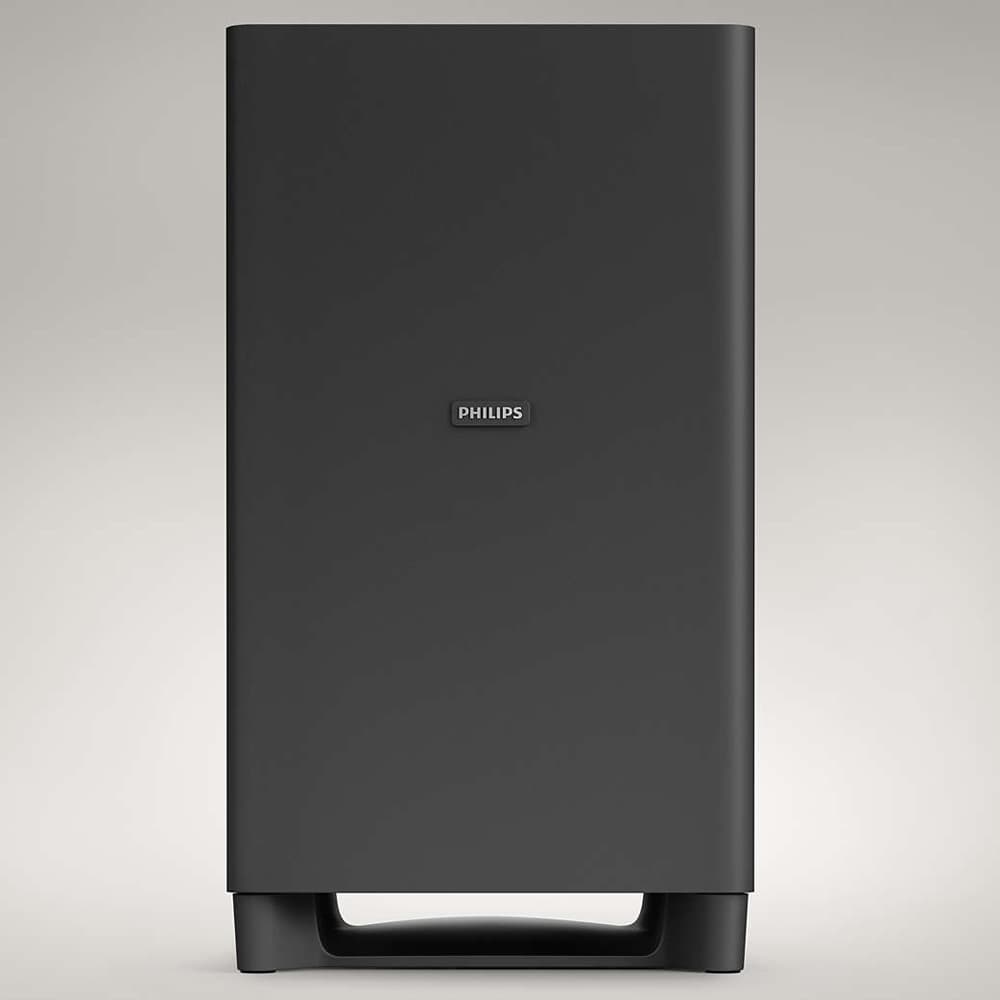 Этот блок комплекта выполнен в виде горизонтально вытянутого бруска, верхняя и лицевая поверхности которого обтянуты тканью. Длина его немалая — 58 см, но в сравнении с основным устройством уже знакомого нам саундбара Philips HTL7140 это не так уж много, чуть больше половины.