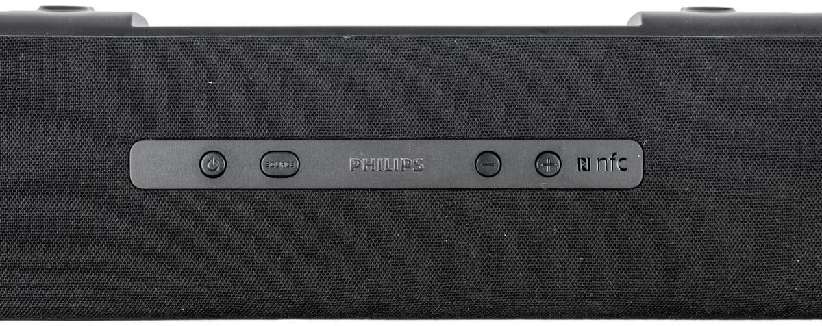 В середине верхней панели АС расположены четыре кнопки: управления питанием, выбора источника и уменьшения/увеличения громкости. Там же находится метка NFC для установки соединения с внешним устройством по Bluetooth.