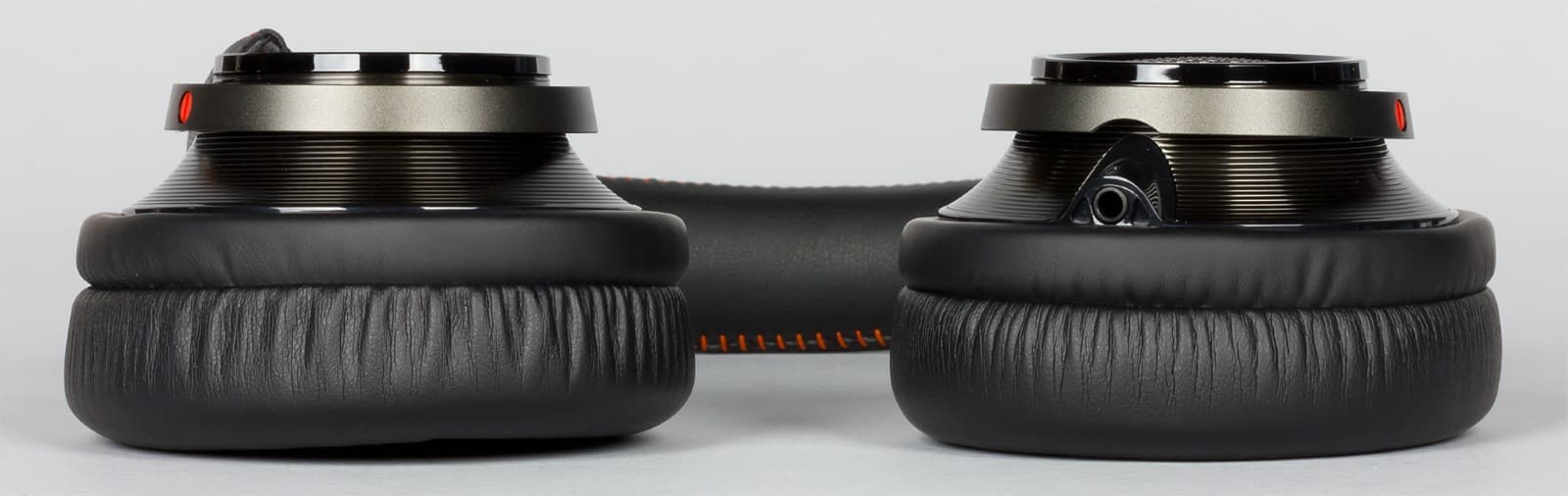 Чашечки соединены с оголовьем с помощью легких креплений — оранжевых штырьков из пластмассы. Сами чашечки используют более основательный материал — алюминий. С торца выделяются решетки, также изготовленные из металла. Звук наушников частично «утекает» из них, так что полной изоляции от вашей музыки добиться не получится.