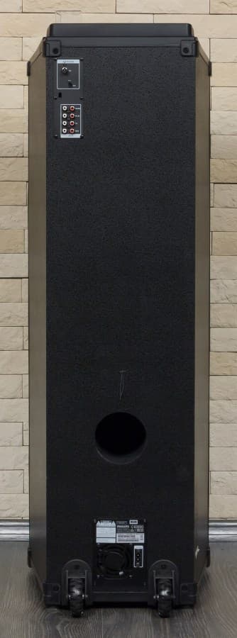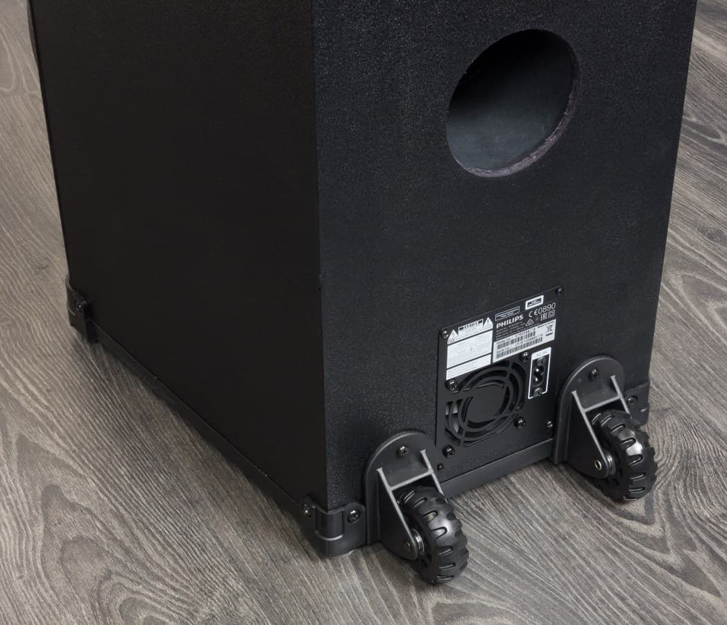 Ниже размещен фазоинвертор, решетки весьма шумной активной системы охлаждения и стандартный разъем для подключения сетевого шнура. Крупные колесики мини-системы выглядят надежно, здесь для декоративности места нет.