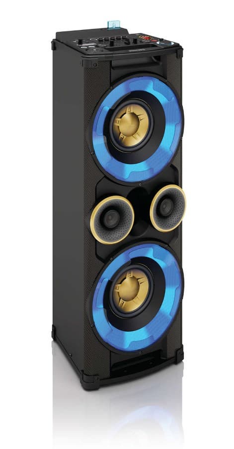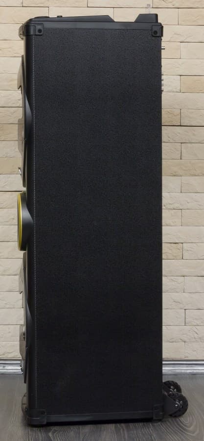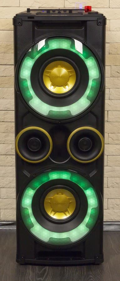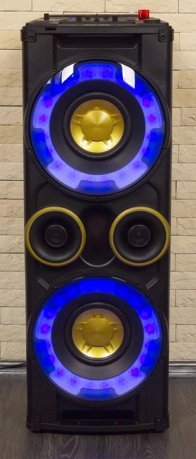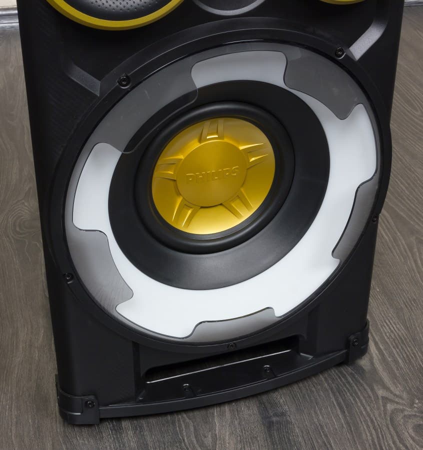 Сверху и снизу размещено по восьмидюймовому НЧ-динамику, окрашенному в золотой цвет. Каждый окружает подвес из кожезаменителя, черная пластиковая вставка и контрастная белая, за которой сияет гирлянда светомузыки.
