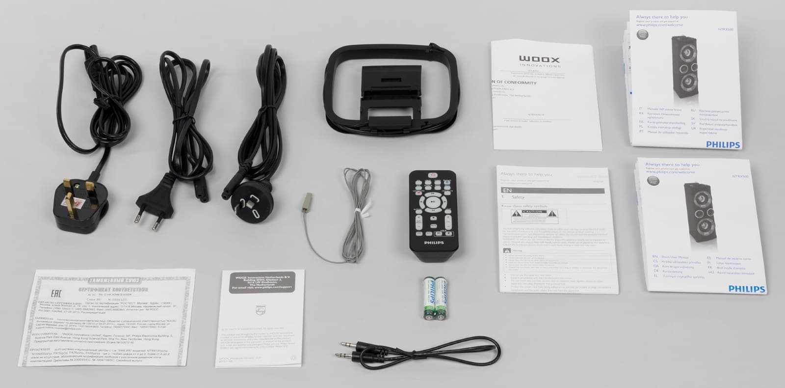 Будучи крупногабаритным устройством, Philips NX5 поставляется в обычной картонной коробке, обложенной изнутри пенопластом. В комплекте с колонкой поставляется три сетевых кабеля с разными вилками, FM- и AM-антенны, кабель TRS 3,5 мм, пульт дистанционного управления с парой батареек, инструкция, гарантийные и прочие бумажки.