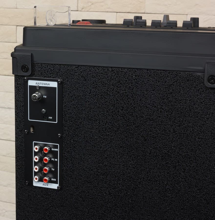 В верхнем углу Philips NX5 предусмотрено четыре пары аудиовходов RCA, что позволит подключить сразу множество домашнего оборудования. Переключаются стереопары циклически, с помощью кнопки Aux на мини-системе или ПДУ. Здесь же находятся гнезда для подключения FM- и AM-антенн, обе имеются в комплекте.