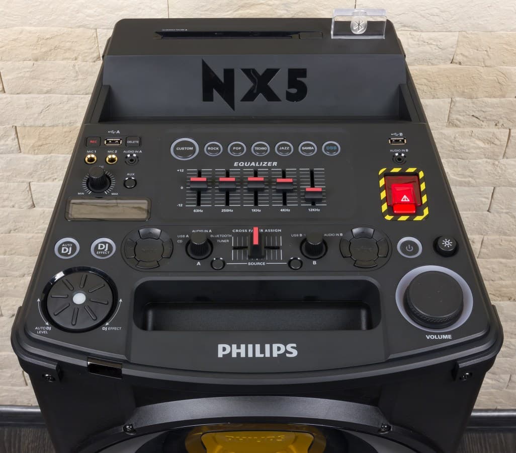 Однокомпонентная система Philips NX5 спроектирована так, чтобы привлекать внимание окружающих. Яркие контрастные элементы и обилие разнообразной подсветки должны обеспечивать не только звуковое, но и световое представление «зажигательной вечеринки».