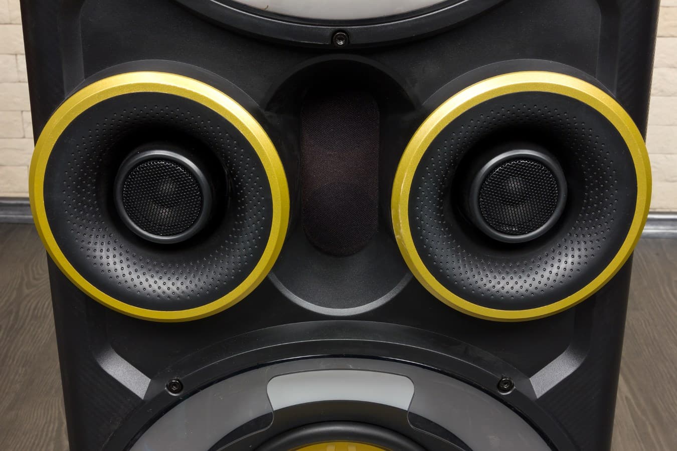Посередине установлена пара твитеров. Несмотря на то, что их золотые окружности имеют довольно крупный диаметр, сами твитеры достигают размера всего в два сантиметра, как в портативных колоночках. Зато они защищены пластиковой сеткой, так что повредить их сложнее, чем вуферы. Между твитерами в корпусе имеются отверстия, затянутые тканью. Возможно, это часть системы улучшения качества звука Bass Reflex.