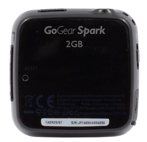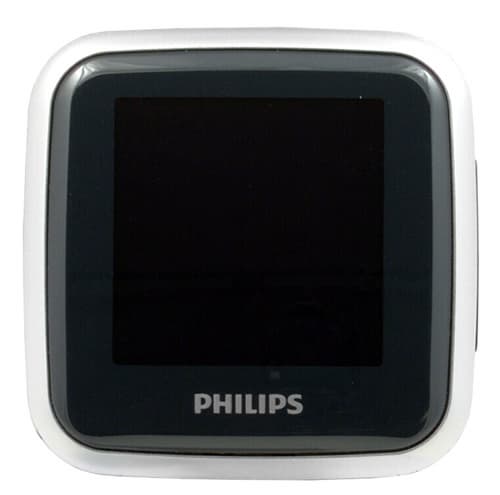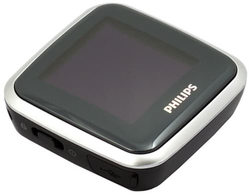 Как видно по фотографиям, на лицевой панели кнопок как бы и нет. Но не раз мы рассматривали плееры от iriver, в которых использовалась фирменная система управления под названием d-click. Суть ее заключалась в том, что кнопки спрятаны под лицевой панелью, под дисплеем, под каждой из четырех граней, и для нажатия надо надавить на края корпуса. В данном плеере схема управления полностью копирует d-click, кнопки спрятаны под лицевой панелью. Различие лишь в том, что в Philips для выбора опций на верхнем торце имеется кнопка, а в iriver для этого надо было совершить длительное нажатие на кнопку «Вправо».