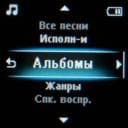 Пункт «Музыка», который стоит первым в главном меню, открывает нам доступ к библиотеке музыки, которая разбивается на такие категории, как «Все песни», «Исполнители», «Альбомы», «Жанры», «Списки воспроизведения», «Книги». Если в какой-то категории слишком много пунктов, то при длительном нажатии вверх/вниз на экране начнут пролистываться буквы, и, остановившись на нужной, можно начать просмотр пунктов списка, начинающихся на эту букву. Пользоваться этой фишкой довольно удобно.