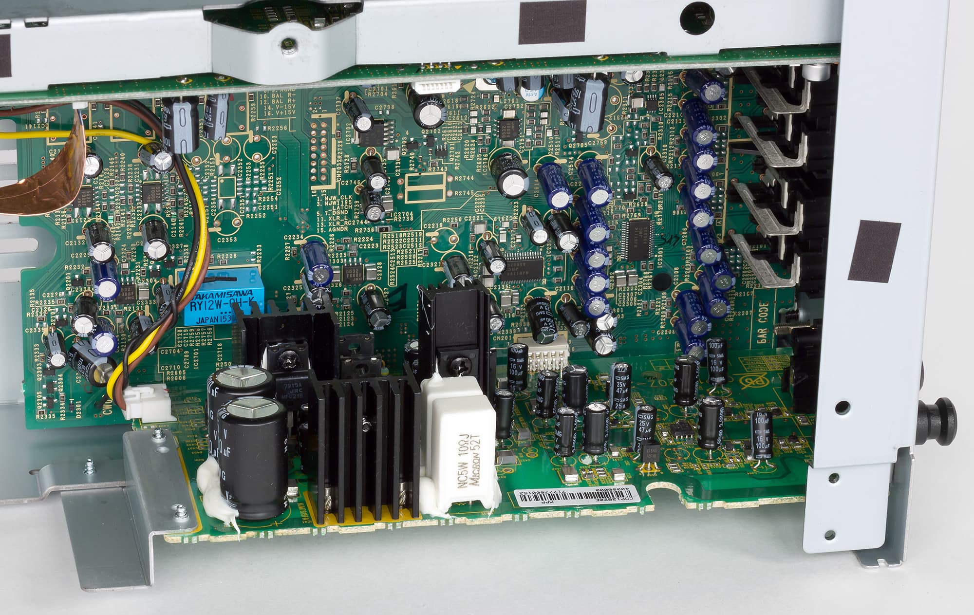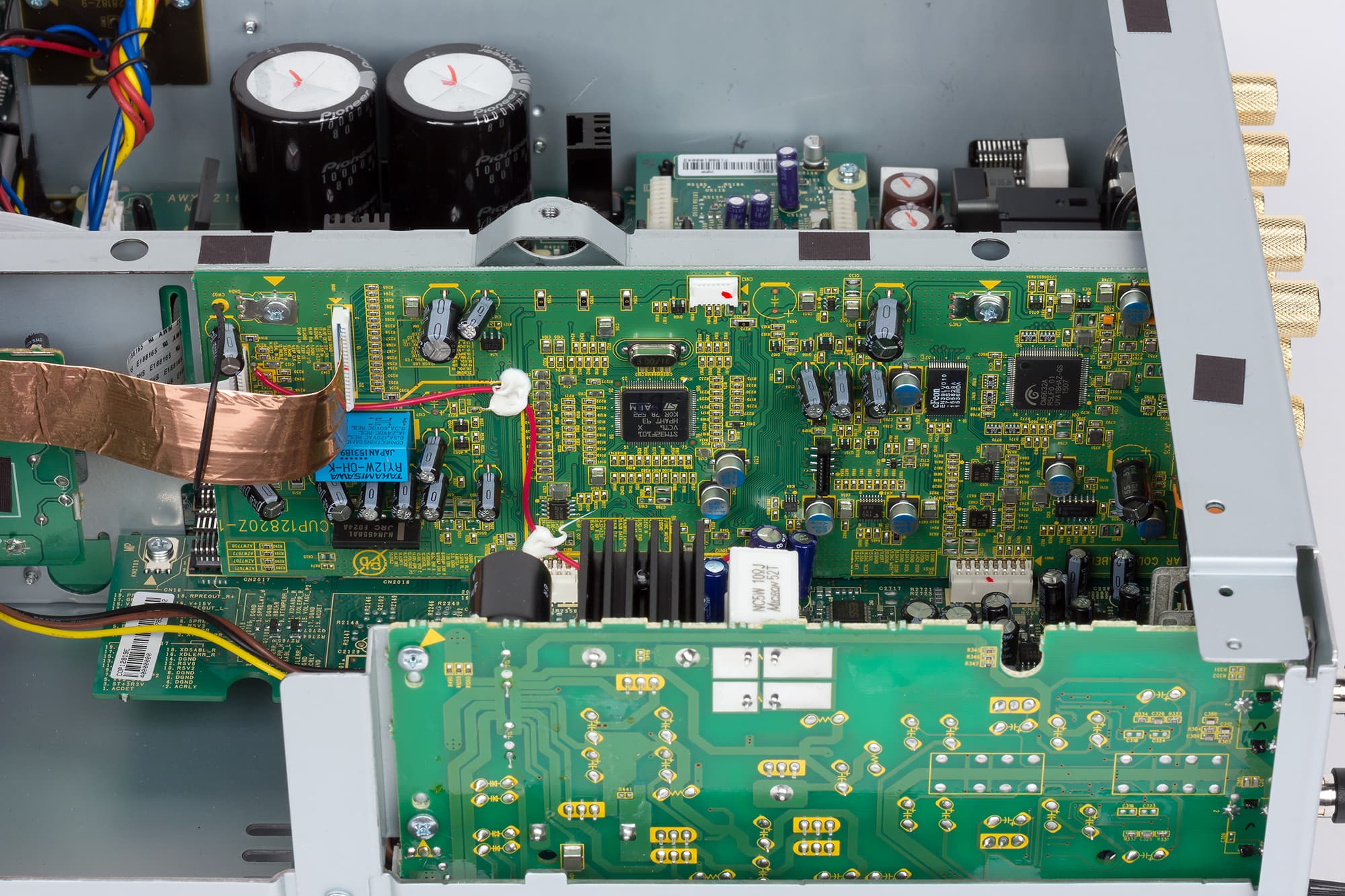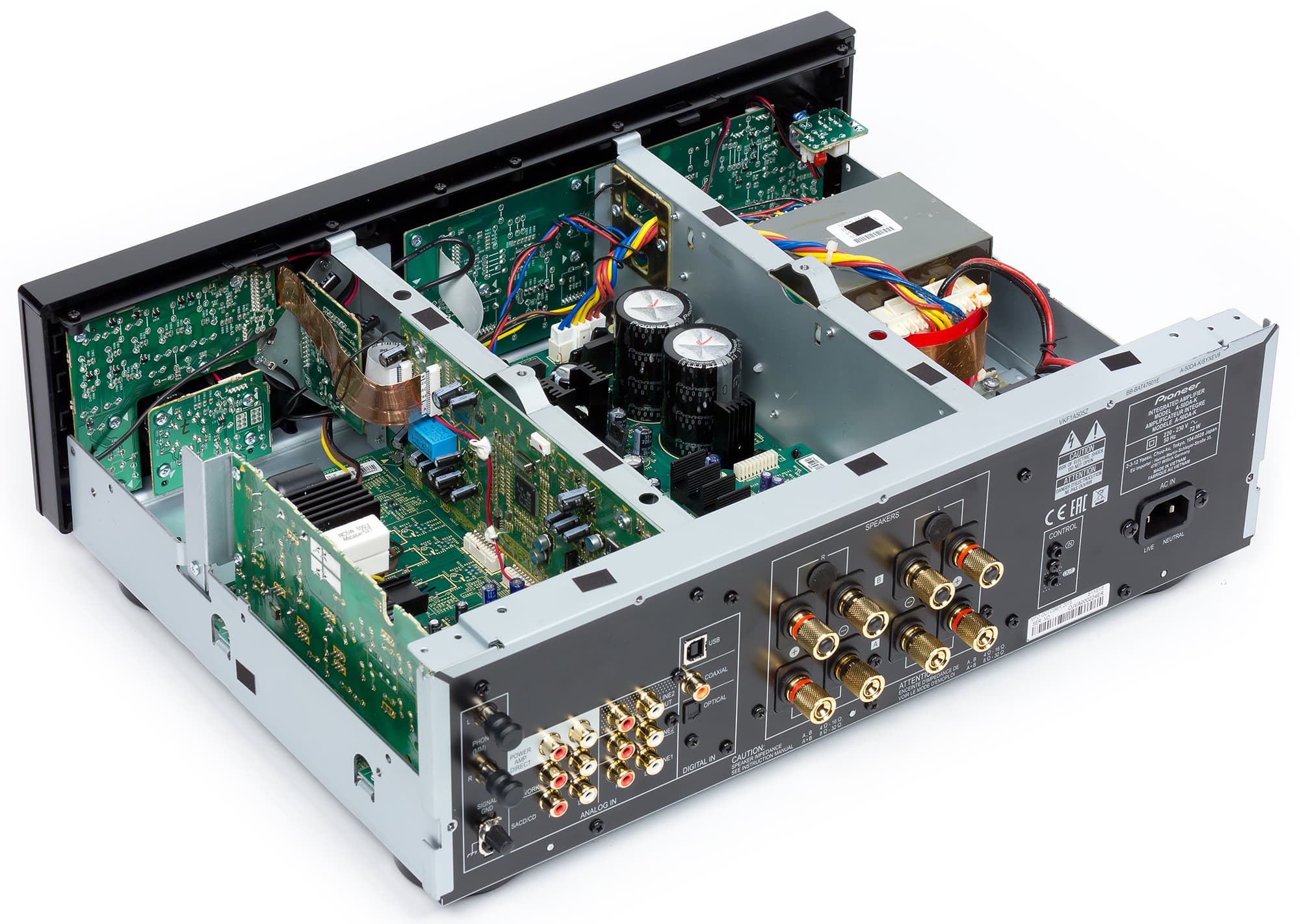 Видно, что даже в усилителе классе D компания Pioneer использует линейный источник питания с трансформатором на Ш-образном сердечнике. С целью снижения перекрестных помех секции предварительного усилителя, усилителя мощности и контрольных схем питаются от отдельных изолированных обмоток силового трансформатора, а ЦАП, предварительный и оконечные усилители собраны на разных платах, размещенных в разных отсеках шасси. Отсеки образуются перегородками, которые, в свою очередь увеличивают жесткость корпуса.