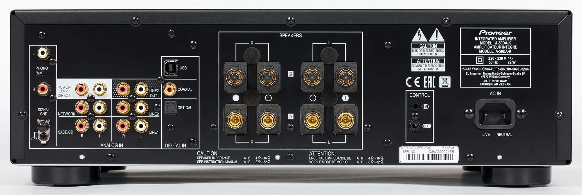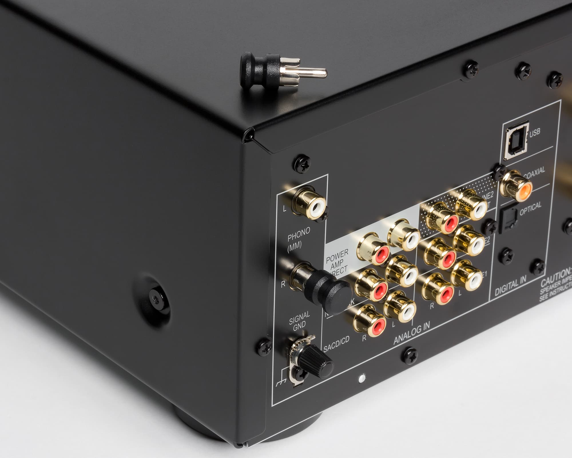 Аналоговая коммутация на задней панели не претерпела изменений: четыре линейных RCA-входа и вход для сигнала MM-звукоснимателя (звукоснимателя с подвижным магнитом). Также имеется вход и выход для совместного с другими компонентами управления питанием. Как и на предшественнике, имеется прямой вход Power Amp Direct. Выходные клеммы разнесены достаточно далеко, пользоваться ими удобно. Пришлось поневоле обратить на это внимание, т. к. подключение происходило акустическими проводами большого сечения, и никаких проблем не возникло.