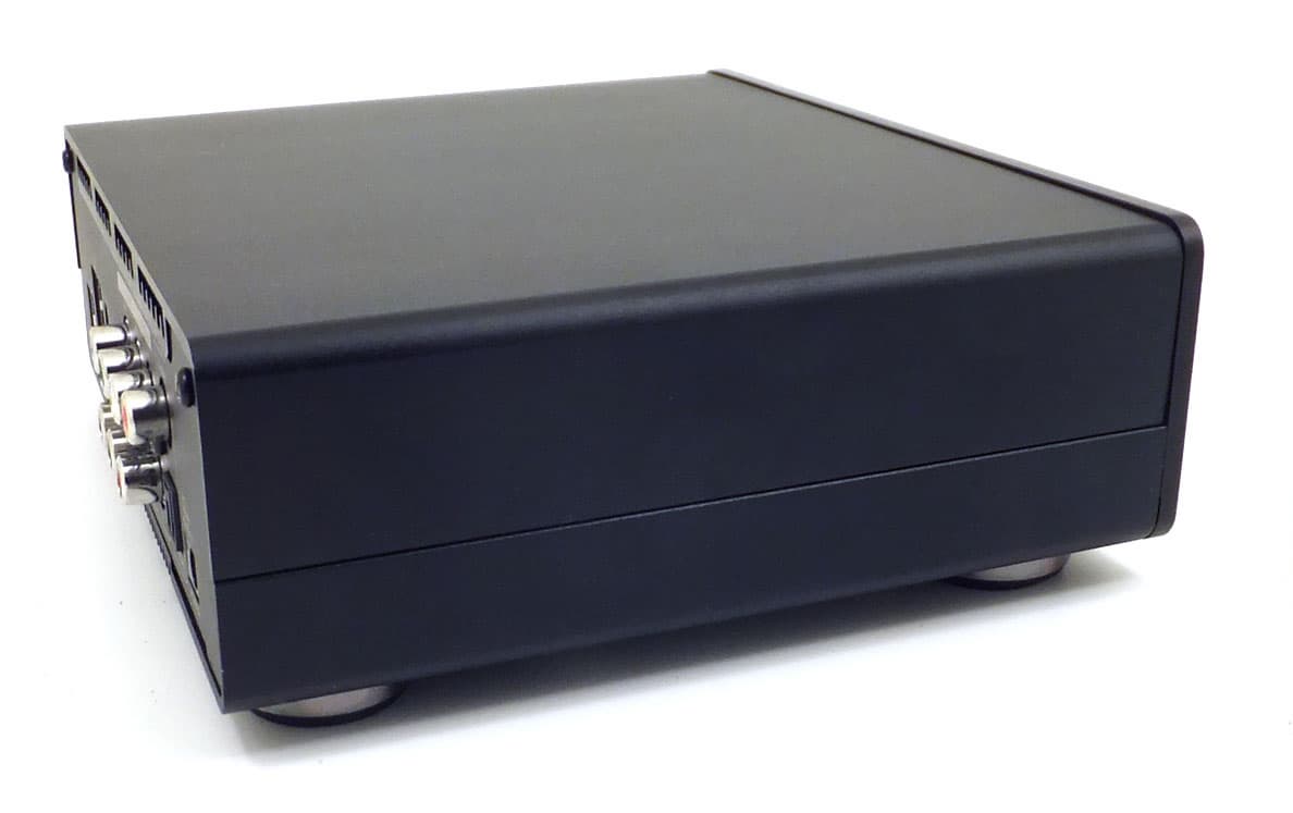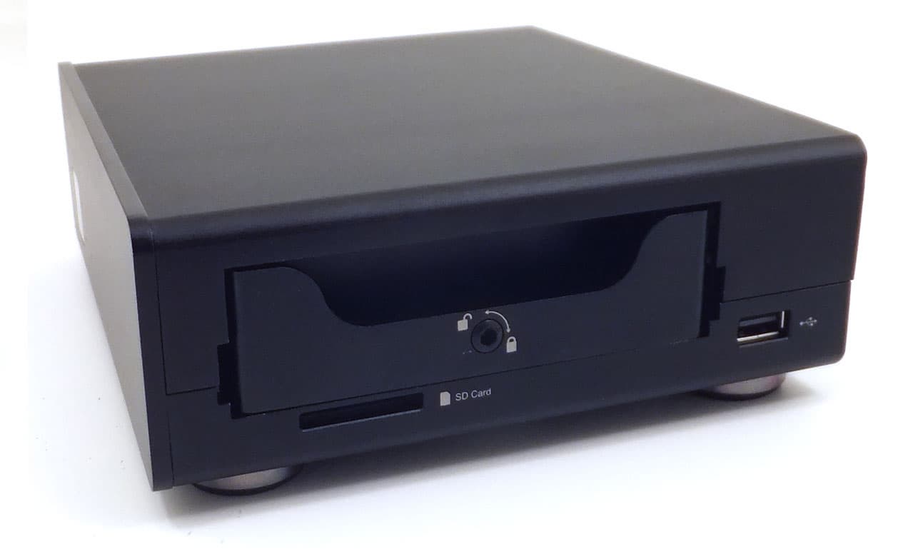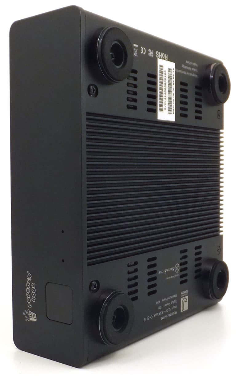Корпус плеера изготовлен из толстого штампованного металла с чёрным матовым покрытием. Отсутствие глянца весьма приятно, он порядком надоел. Плеер не имеет никаких кнопок, все операции предполагается выполнять либо с помощью прилагаемого пульта ДУ, либо посредством приложения для мобильных платформ. Лицевая панель содержит непрозрачное окошко, в котором прячется инфракрасный датчик, улавливающий сигналы пульта. Чуть в стороне имеются два отверстия, где установлены неяркие светодиоды — красный и белый. Эти светодиоды отображают текущий режим работы аппарата: спящий и активный.