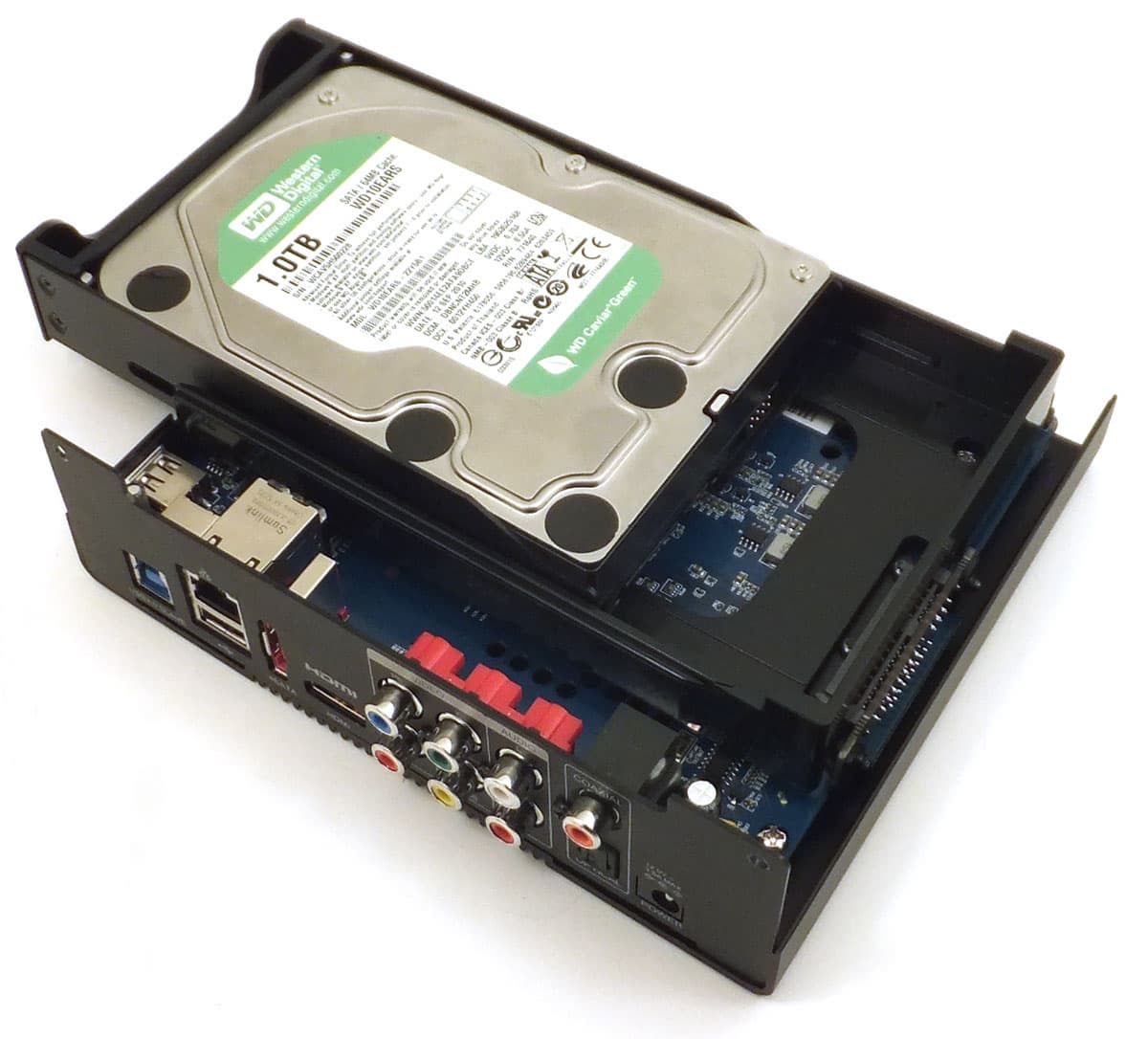 При снятой верхней крышке плеера видно расположение жёсткого диска внутри корпуса. Будучи полностью вставленным в плеер, HDD занимает почти всю его ширину.