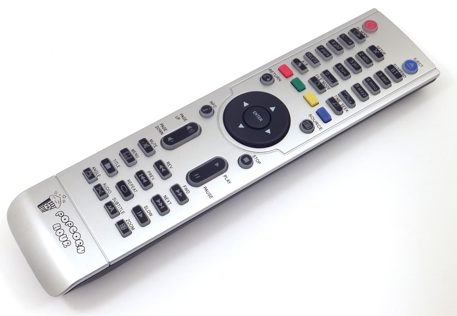 Чёрно-серебристый пульт ДУ стандартен для плееров Popcorn Hour. Всё те же кнопки, с той же белой подсветкой, работающей в течение пяти секунд после нажатия.
