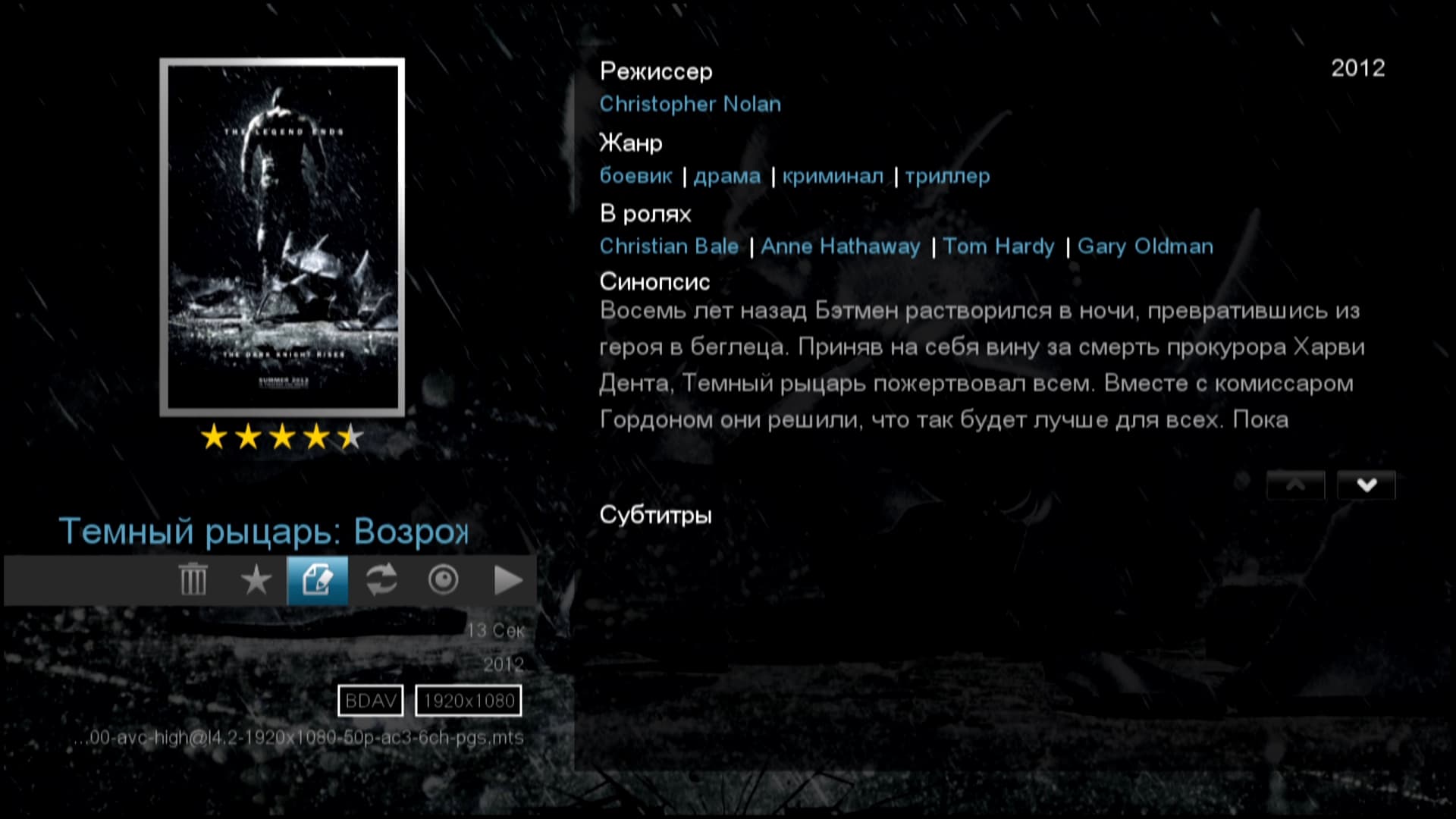 Некоторые пользователи домашних медиаплееров, лишённых сервиса, подобного Jukebox, присваивают файлам названия, где присутствует краткое описание фильма. Например, часто в название файла добавляются слова-определения: фантастика, боевик, триллер, драма, криминал. Например: Темный рыцарь — Возрождение легенды (фантастика, боевик, триллер, драма, криминал).mkv. Ну, так пользователю удобнее (и автор тут не исключение). Однако при использовании Jukebox подобные выкрутасы с переименованиями файлов абсолютно излишни. Достаточно щёлкнуть на пульте ДУ кнопку OK — и на экране появится исчерпывающая информация о фильме.