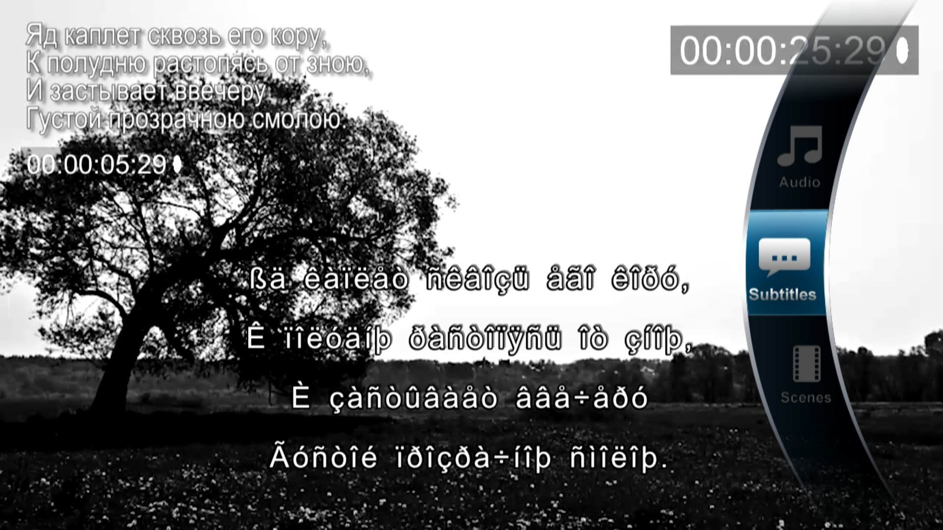 Плеер корректно работает с титрами, сохранёнными в кодировке WIN1251. Но это утверждение касается лишь титров, вшитых в файл. Внешние субтитры, расположенные отдельным файлом в папке с видео, отображаются «кракозябрами».