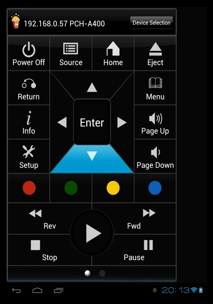 В заключение требуется рассказать о функциях удалённого управления плеером. По всей видимости, инфракрасный пульт ДУ нынче выходит из моды. Другое дело — графический интерфейс, touch-кнопки, все дела. Есть такой программный пульт и для нашего плеера, Popcorn Hour Remote Control (версия для Android, версия для iOS). Наглядно, симпатично, да и просто удобно. Вот если бы батарейки в смартфонах и планшетах работали подольше…