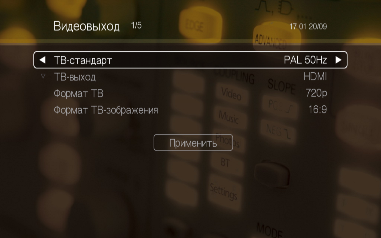 Теперь давайте проверим, какие настройки доступны для этого режима. Для доступа к ним нужно выбрать на первом экране соответствующий пункт или использовать кнопку на пульте. Параметры собраны на пяти страницах. Первая отвечает за настройку аудио-видео выходов. На плеере есть несколько актуальных видеовыходов, так что сначала надо определиться с типом подключения. Потом выбрать интересующий стандарт (PAL или NTSC), разрешение (поддерживаются все, вплоть до 1080p) и режим панорамирования. Этих настроек вполне достаточно для полноценного отображения любого видеоконтента, включая Full HD. Однако, в плеере отсутствует поддержка режима 24p, в результате чего на некоторых видеофайлах могут появляться небольшие «задержки», особенно на панорамных сценах. Но не исключено, что этот режим будет добавлен производителем впоследствии в следующих версиях микропрограммы.