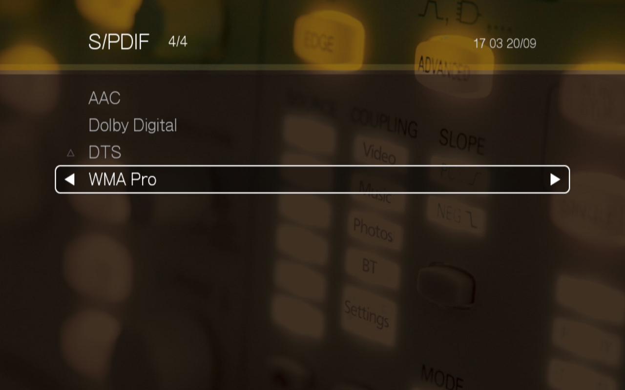 Для звука также сначала выбирается вариант подключения — аналоговый (только стерео), S/PDIF или HDMI. Первый и третий не имеют больше никаких настроек, а для S/PDIF можно выбрать декодирование звука в устройстве (только в стерео) или вывод цифрового потока в исходном виде для дорожек в форматах AAC, DD, DTS и WMA Pro. Здесь же есть отдельные настройки яркости, контраста, насыщенности и оттенка, актуальные для аналоговых подключений.
