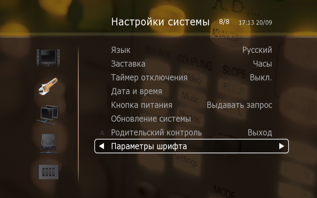 Вторая страница — системные настройки. Прежде всего, это язык. Русский в выборе присутствует, его включение означает также и перевод всего интерфейса. Отметим, что русский шрифт в плеере так же красив, как и английский. Второй параметр — настройка заставки. Можно выбрать показ логотипа или часов и время включения заставки. Есть в плеере и таймер отключения, который можно поставить на интервал от пятнадцати минут до двух часов. Встроенные часы кроме установки времени и даты предусматривают и выбор их форматов. Действие, которое происходит при нажатии на кнопку выключения питания, тоже поддается настройке — выключить, перейти в режим сетевого накопителе, предоставить выбор пользователю. Как и в большинстве аналогичных устройств, есть пункты обновления прошивки, сброса конфигурации и пароля Web-администратора. Для защиты подрастающего поколения, можно установить дополнительные ограничения на доступ к интерфейсу устройства через пульт дистанционного управления. Последний параметр в этой группе — замена используемого по умолчанию шрифта для отображения текстовой информации. Можно загрузить свой любимый шрифт в формате TTF, после чего плеер будет использовать именно его. Мелочь, но приятно.