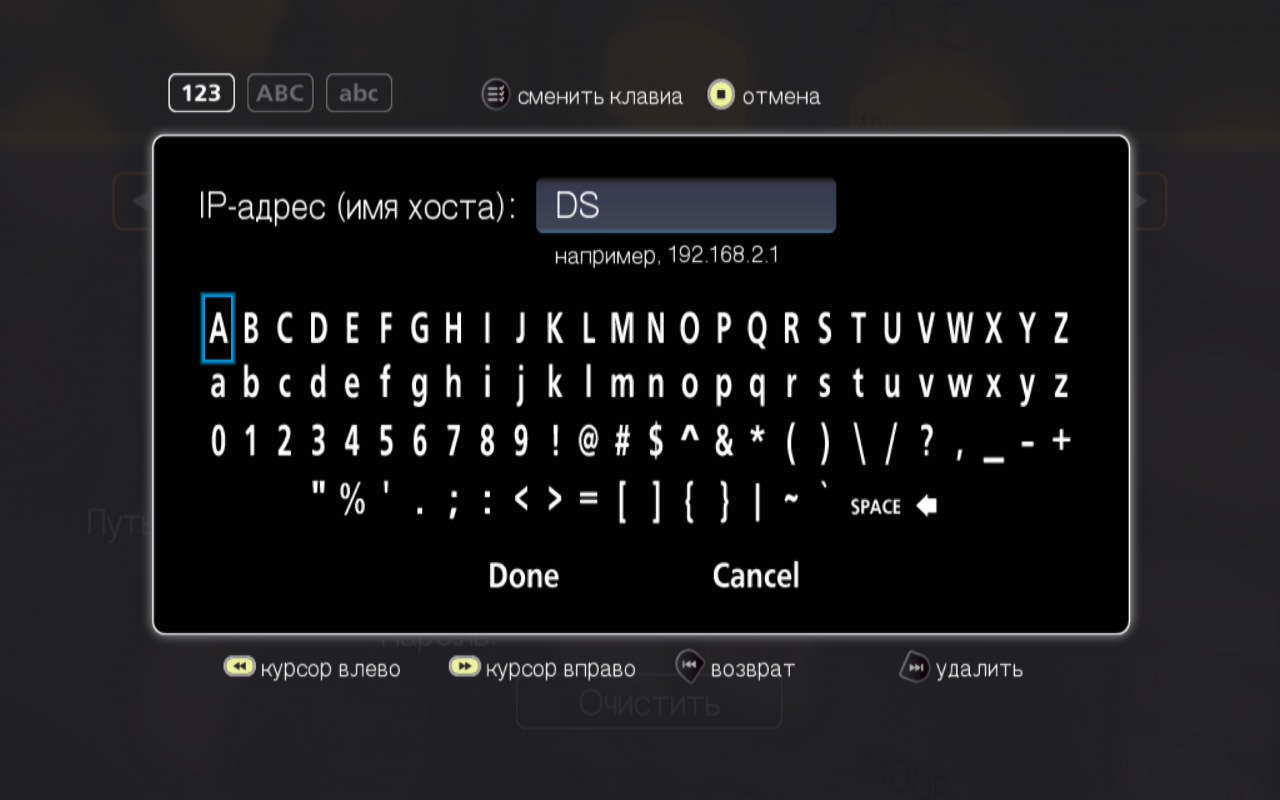 Следом идет настройка подключений к сетевым ресурсам. Поддерживаются сетевые протоколы SMB/CIFS и NFS. Всего удаленных дисков может быть шесть. Тестирование на подключение к ПК под управлением Microsoft Vista и сетевому накопителю прошло успешно. Также имеется информация о поддержке Windows 7. Установка сетевых адресов может осуществляться в ручном режиме или же с использованием браузера сети (только SMB). Для каждого ресурса на экранной клавиатуре вводятся все необходимые параметры, в том числе имя пользователя и пароль (при необходимости). Оба варианта подключения поддерживают корректное отображение русских имен файлов и путей, что не может не радовать.